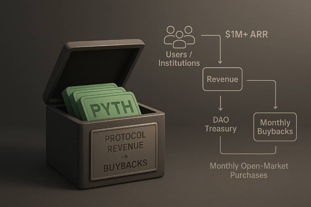 Ecosystem revenue → PYTH DAO treasury → monthly PYTH purchases on the open market.